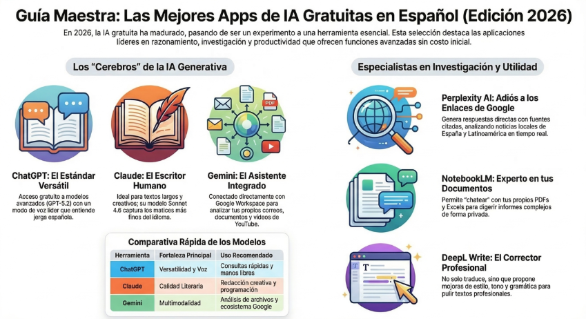 Después de «pelearme» con casi todas ellas, he seleccionado las que realmente aportan valor en nuestro idioma sin que tengas que sacar la tarjeta de crédito a la primera de cambio. Porque sí, en 2026 la IA gratis ha madurado, pero hay que saber dónde buscar.