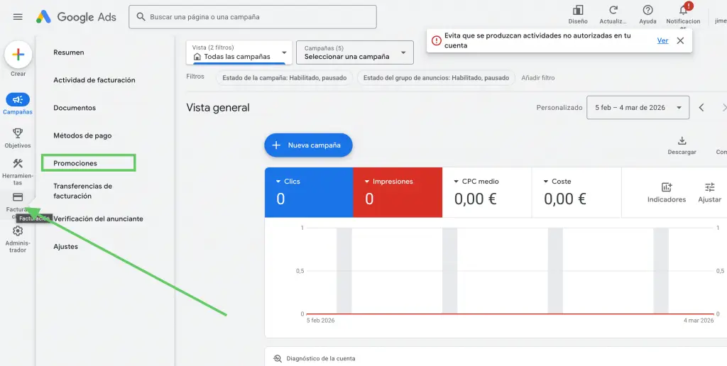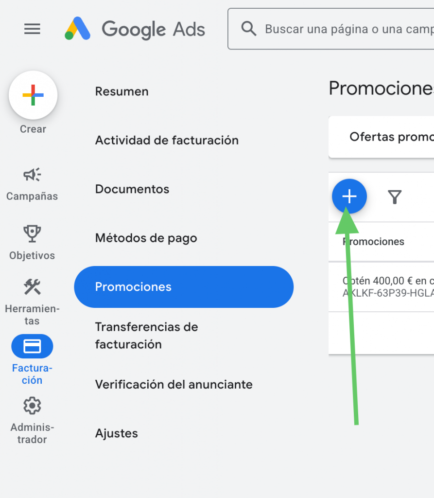 PASO 1: Accede a la configuración de Facturación: Entra en tu cuenta de Google Ads. En el menú superior (o lateral, dependiendo de tu versión), haz clic en el icono de la llave inglesa: Herramientas y configuración. Una vez se despliegue, busca la columna de Facturación y selecciona Promociones.