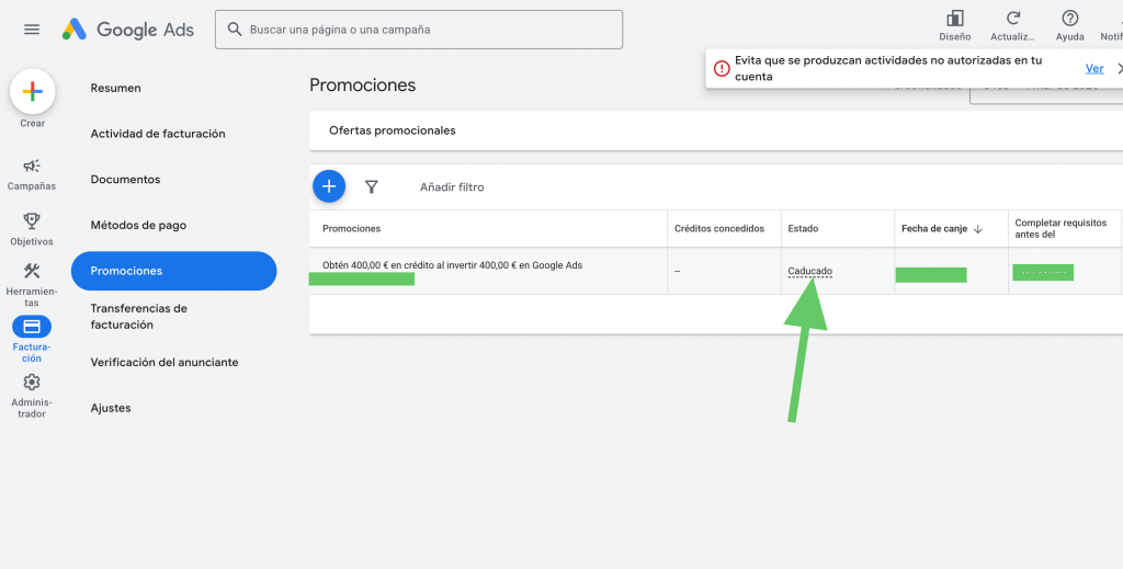 - La barrera del gasto real: Imaginemos que aspiras al cupón de 400€. Para que Google «desbloquee» ese regalo, primero debes haber gastado de tu bolsillo esos primeros 400€.