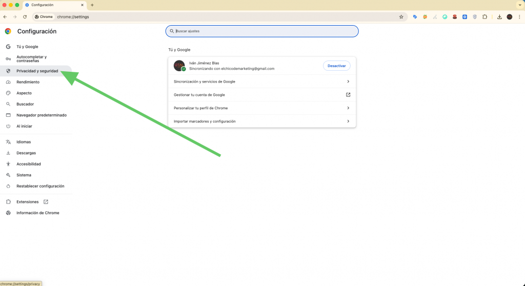 Entra en el apartado de Privacidad y Seguridad: En el menú lateral izquierdo, busca la opción «Privacidad y seguridad».