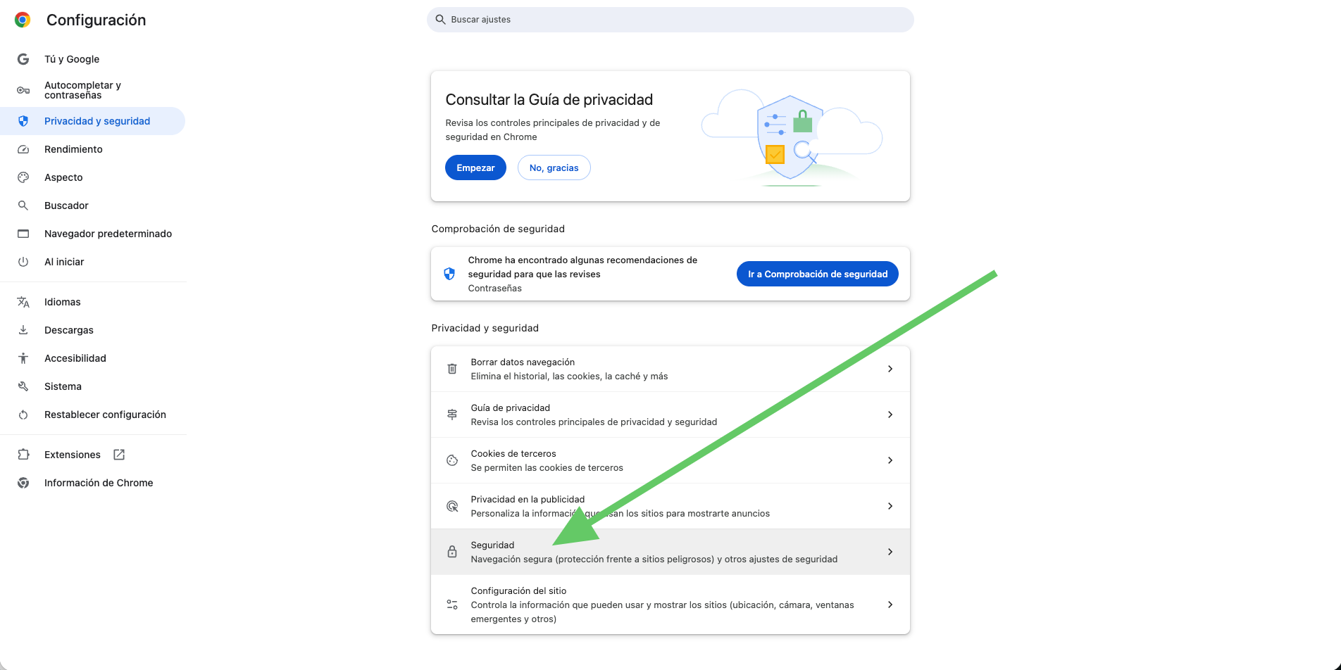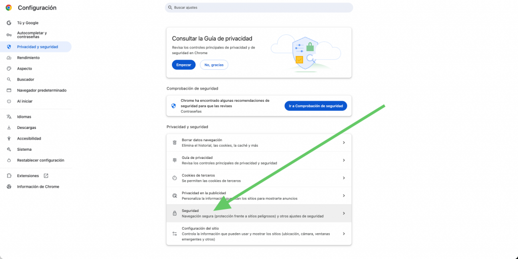 Una vez dentro, verás varias opciones relacionadas con la navegación segura. Haz clic en la sección que dice simplemente «Seguridad».
