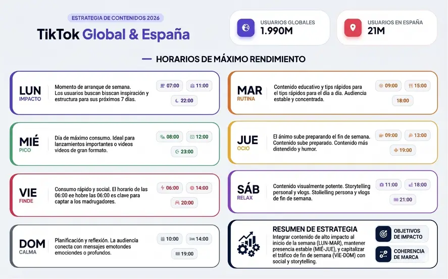 Basándonos en los datos más recientes de este 2026, hemos identificado tres franjas de «oro» en el territorio español. Si buscas las mejores horas para subir TikTok España, apunta estas citas en tu calendario de contenidos: