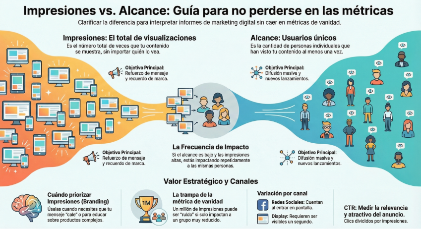 Como consultor digital con más de 10 años de experiencia, siempre digo lo mismo: las impresiones son el combustible, pero no son el destino. Sirven para alimentar el resto del embudo de ventas. Si te obsesionas solo con ellas, estarás tirando el dinero en «ruido» digital.